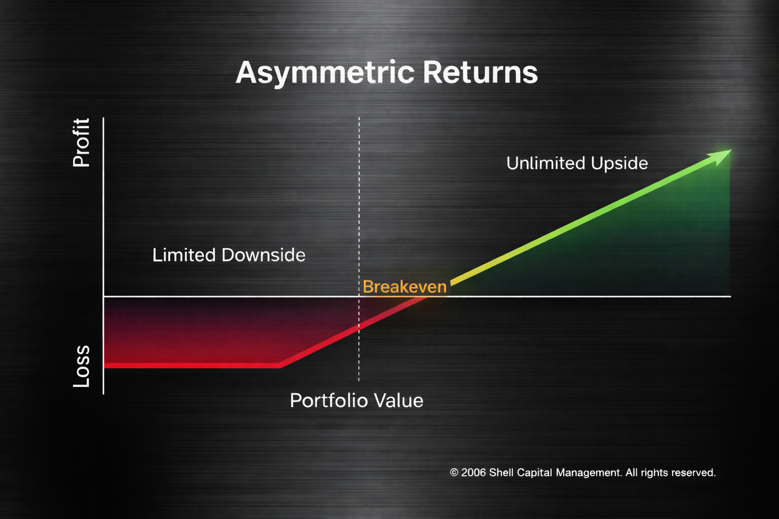 Asymmetric returns refer to an investment payoff structure where downside risk is explicitly limited while upside potential remains materially larger, producing a positively skewed, convex distribution of outcomes that protects compounding and enhances long-term capital durability.