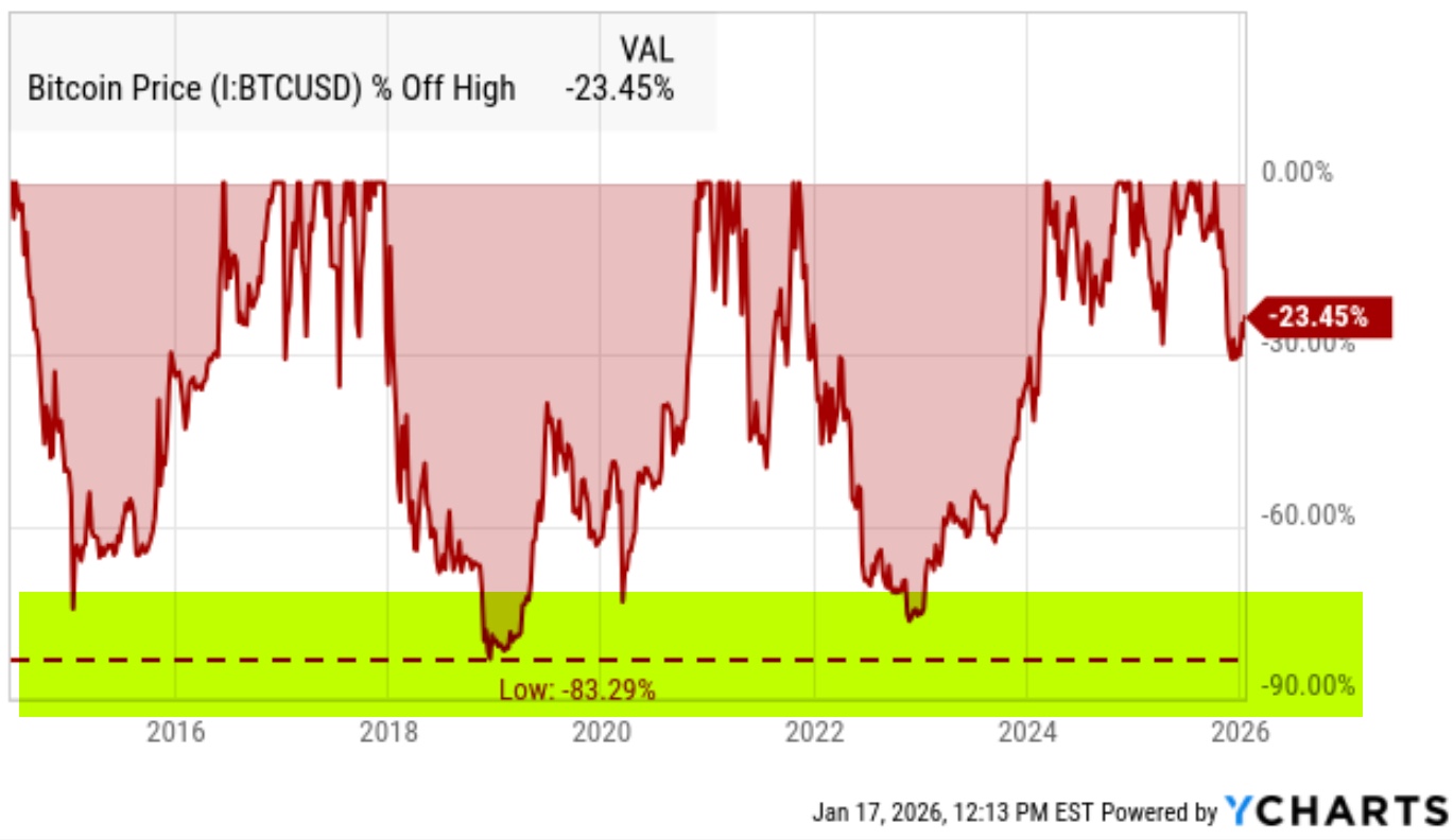 Bitcoin is a very risky asset. Yes, it's also very volatile, but we define risk in real, absolute terms: drawdowns. As evidenced by YCharts, Bitcoin has spent much of its trend in deep drawdowns as high as -83%.